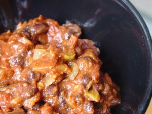 But maybe I’m changing my tune. This chili contains no beef or dreaded kidney beans, but has plenty of black and small red beans supported by a flavorful tomato base. Dinner came together quickly, and the result is both delicious and filling.