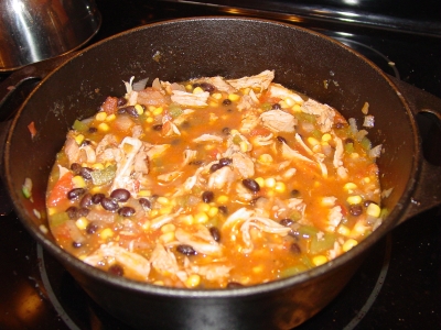 Remove chicken from pot; stir in corn and black beans, and simmer until heated through, about 5 minutes. Meanwhile, shred chicken meat with two forks. Return chicken to pot, and stir to combine.