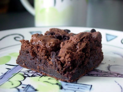 The end result is satisfying — chocolately, minty, delicious — but that gooey layer isn’t there! There is a layer, but it’s not as squishy and thick as I’d hoped, and the brownie itself is drier than I’d prefer. I think I’m going to play with this recipe again and see if I can’t get it closer to what I’d pictured (the Platonic ideal of Junior Mint Brownie, if you will.)