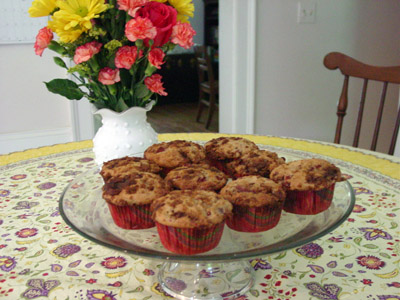 Extremely moist and flavorful, these muffins have a sweet brown sugar-cinnamon topping and mildly vanilla flavored base studded with fresh bits of rhubarb and strawberry. If you’d like more of a rhubarb bite, increase the rhubarb and decrease the strawberries, as long the total amount of vegetable/fruit comes to 2 cups — or just use Joan’s original recipe! (I’ve got some rhubarb left over, and I’m thinking that’s just what I’ll do.)