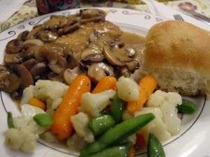 Reduce heat to medium and add mushrooms, garlic and and a tablespoon of butter to pan, stirring occasionally, being careful the garlic doesn’t burn. Cook about 3 min, until softened and browned. Stir in Marsala, stock, and half and half. Add cutlets; reduce heat to LOW.