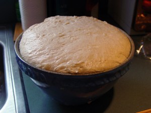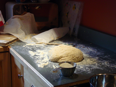 11:55am: Well, I’ve been reminded as to why I hate kneading. The dough gets EVERYWHERE. Stuck to the counter and my hands of course, but also in my clothes, my hair, nearby cabinetry, the bread box (ironically) and even the dog, who stuck close by to catch any scraps that would fall like manna from heaven. Of course, I’m not sure if you can call what I did kneading – more like “Wrestling with the Sticky Yeast Monster.”