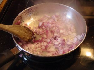 Sautéing the onions for the focaccia.