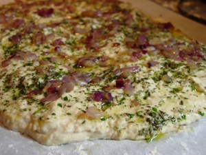 1:20pm: After rising for two hours, the dough is easier to handle, but still very sticky. I used 2/3 of the dough to shape (and I use the term very loosely) a focaccia and topped it with some herbed oil, salt, and sautéed red onions.