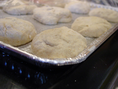 Butter a 13 x 9 inch sheet cake pan or a shallow cake pan. Cut the dough into 12 equal pieces. Shape each into a ball under the palm of your floured hand and place on the baking sheet, leaving 1/2 inch between the balls. Cover with plastic wrap and let rise for about 35 minutes, until puffy and almost doubled.