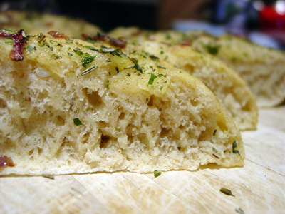 5:07pm: Challenge complete! The focaccia baked up beautifully – despite my dropping it face down on the open door of my oven. (Oh well – could’ve been worse!) Fortunately, it held up very well and it was a very looong ten minute wait before I could cut into it.