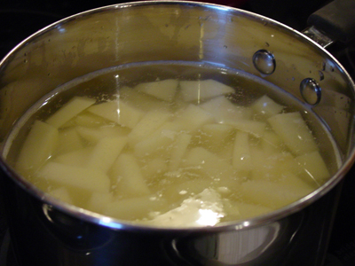 Put the potatoes and 4 cups water in a sauce pan and bring to boil. Add 1 teaspoon salt and cook, half covered, until the potatoes are very tender.