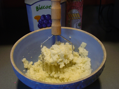 Drain the potatoes, SAVE THE POTATO WATER, and mash the potatoes well. I have a food mill I will run my potatoes through to mash them.