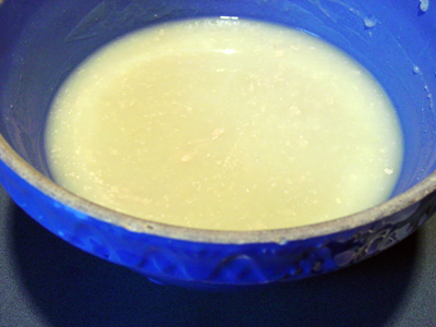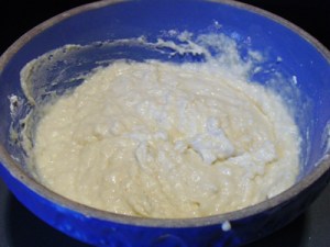 Measure out 3 cups of the reserved potato water (add extra water if needed to make 3 cups). Place the water and mashed potatoes in the bowl you plan to mix the bread in – directions will be for by hand. Let cool to lukewarm – stir well before testing the temperature – it should feel barely warm to your hand. You should be able to submerge you hand in the mix and not be uncomfortable.