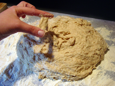 Turn the dough out onto a generously floured surface and knead for about 10 minutes, incorporating flour as needed to prevent sticking. The dough will be very sticky to begin with, but as it takes up more flour from the kneading surface, it will become easier to handle; use a dough scraper to keep your surface clean. The kneaded dough will still be very soft.
