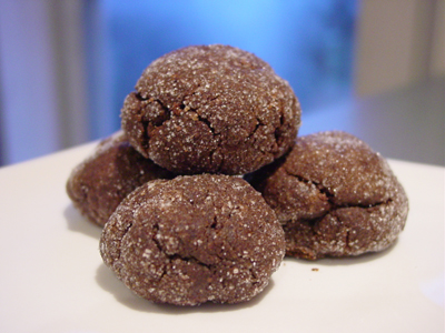Heaped on the tray were scores of dark chocolate cookies, glittering with a light coating of sugar. They had the lovely, heady aroma of cocoa and cinnamon (a combination I love).