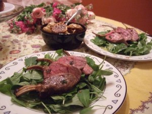 Cut lamb between ribs into chops. Divide arugula among plates. Top each serving with lamb chops. Drizzle warm dressing over and serve warm.