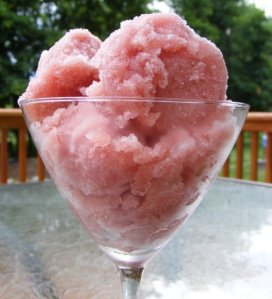 Inspired by this lovely cocktail, the pomegranate margarita sorbet is a refreshing and sophisticated way to end a summer’s meal. In addition to lime and pomegranate juice, there’s a bit of tequila and Cointreau in here; not enough to get a buzz but maybe more than you’d feel comfortable serving children.