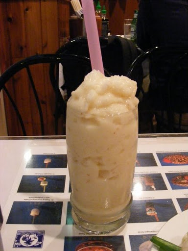 There it is. And, boy was it bland — icy with a vaguely tropical flavor — which made me think there wasn’t much durian in this durian milkshake. But after drinking half, the waitress came over and asked, “You like it?”