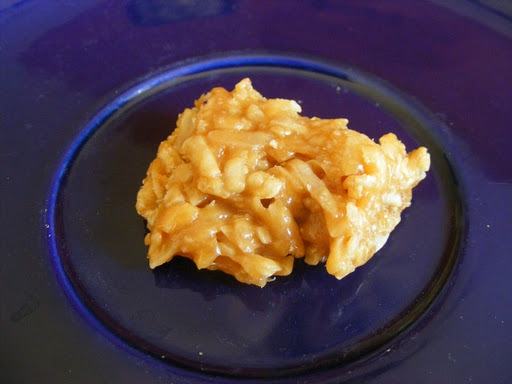 The unused caramel coconut topping didn’t go to waste, however; it was pressed into a rectangle about 1/4-inch thick, allowed to cool, and then cut into bite sized pieces. Voila! Tasty caramel coconut chews.